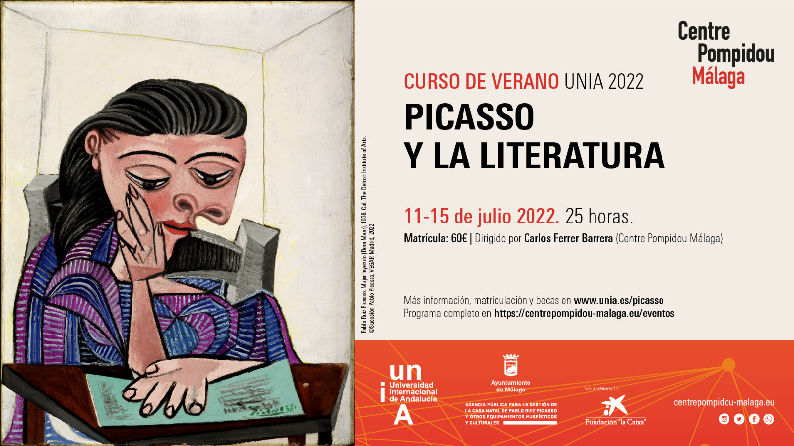 Los cursos de verano de la Universidad Internacional de Andalucía (UNIA) llegan al Centre Pompidou Málaga con Picasso y la Literatura, un programa de sesiones formativas que se llevará a cabo entre el 11 y el 15 de julio. El curso, dirigido por Carlos Ferrer, está orientado a estudiantes y graduados de Historia del Arte, Bellas Artes, Arquitectura, Historia y otras titulaciones de Humanidades. También está enfocado a artistas, personal de centros expositivos, gestores culturales, guías turísticos y al público en general interesado en el arte y en Picasso. La matrícula se puede realizar en a través de la web www.unia.es/picasso